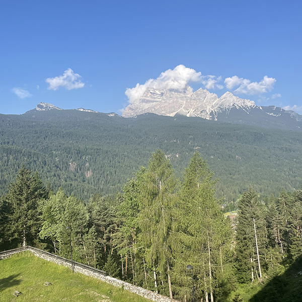 Zicht op een Dolomieten piek vanop de hotelkamer